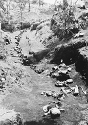 古墳の上やまわりにたて並べられいる埴輪が、列をなして並んでいる状況を埴輪列と呼びます。人物や動物埴輪などの形象埴輪の配置から、その場面が表す意味を解釈する研究が行われています。芝山町では殿塚・姫塚古墳をはじめとするいくつかの古墳で埴輪列が認められました。埴輪列には、「1.当時の生活を再現したもの」「2.政権交代式の儀式の様子」「3.お葬式の列」「4.芸能お祭りの様子」などさまざまな説があります。右の写真(上)では馬子→馬→男子→男子→男子と並んでいます。果たしてこの並び方は何を意味しているのでしょうか。 |